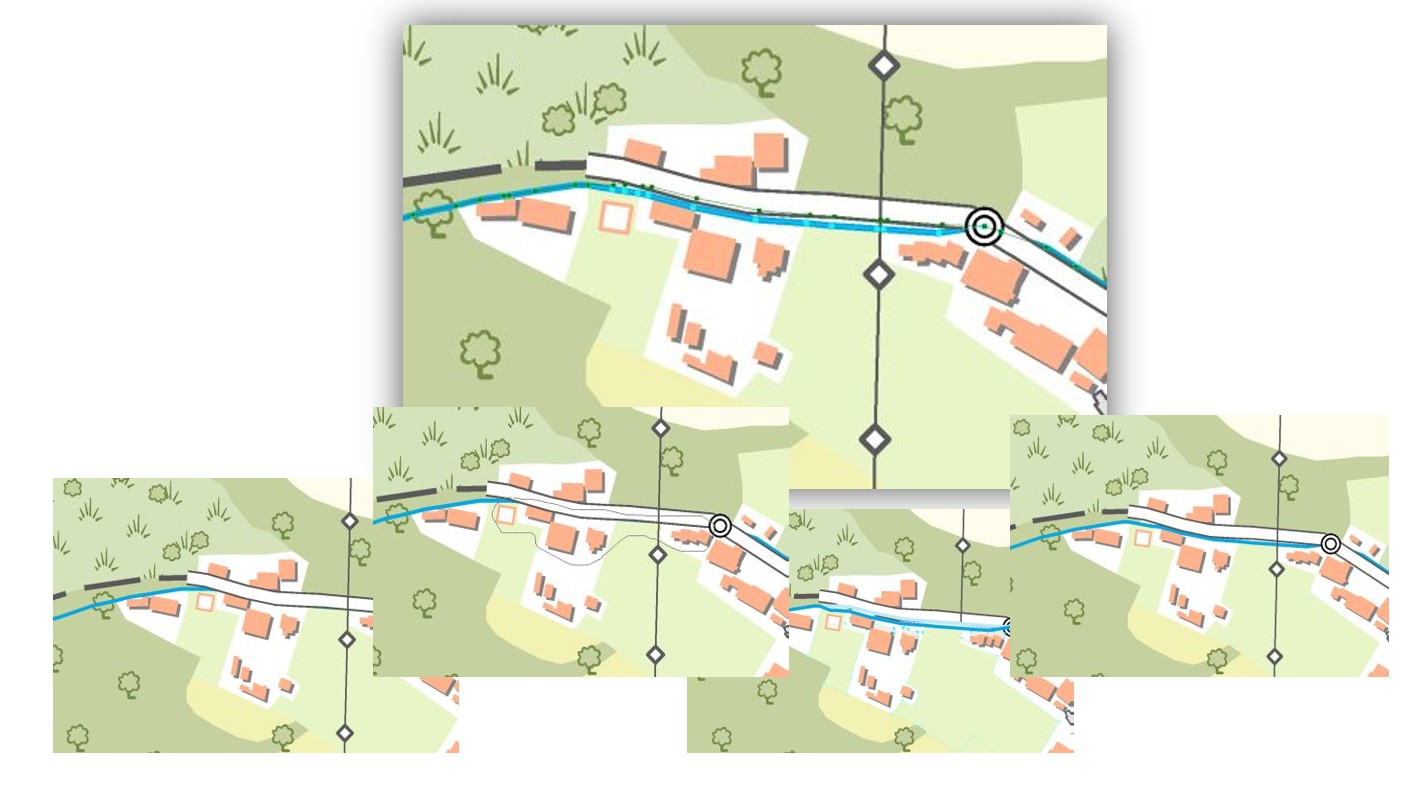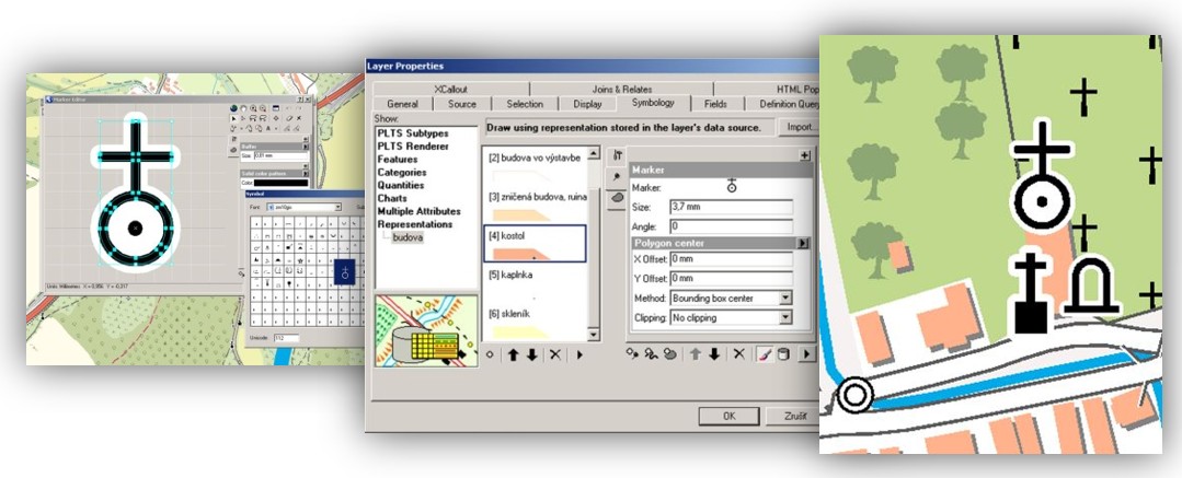 Symbolika pre komplexné kartografické vyjadrenie sa tvorila na základe predbežne schváleného kartografického modelu pre ZM10 - ZBGIS®. Objektom bol priradený symbol (obr. č. 1), s dodatočnou manuálnou kartografickou úpravou (obr. č. 2) v prípade kartografických konfliktov.