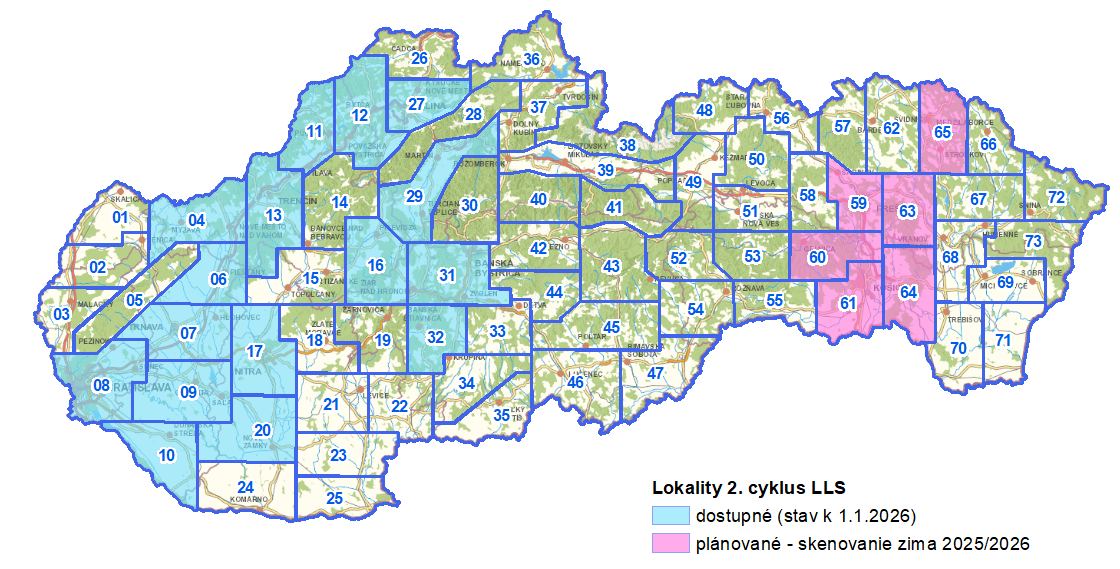 Prehľad územného ohraničenia (footprints) LAS súborov z 2. cyklu LLS